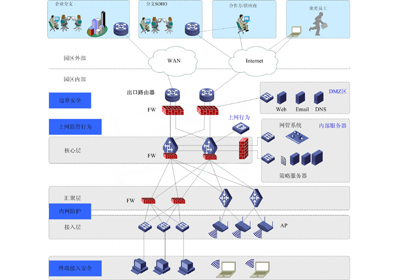 網絡設備系統包含的(de)非常廣泛,不(bù)僅包含著(zhe)路(lù)由器(qì),交換機(jī),無線設備,還(hái)包含防火(huǒ)牆,安全審計→(jì)設備等,為(wèi)了(le)使網絡設備系統更合理(lǐ),經濟性,我們的(de)設計(jì)過程中,遵循著(zhe)先進性,開(kāi)放(fàng)性,可(kě)擴展性,可(kě)維護性↕,高(gāo)可(kě)靠性和(hé)穩定性的(de)原則,合作(zuò)的(de)一(yī)線廠(chǎng₽)商有(yǒu)華為(wèi),H3C,深信服,信銳,銳捷等。